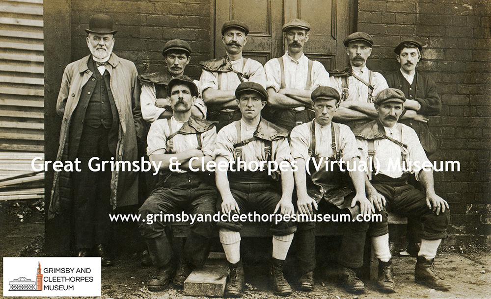 Edwardian Grimsby working men with a single, leather shoulder pad c1905.