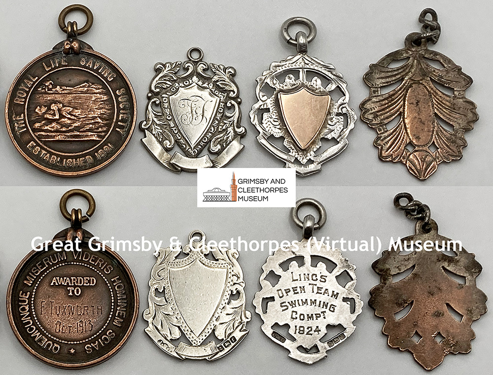 More swimming medals won by Grimsby’s star swimmer, (Alfred) Frank Tuxworth c1905, 1913, 1924 etc.