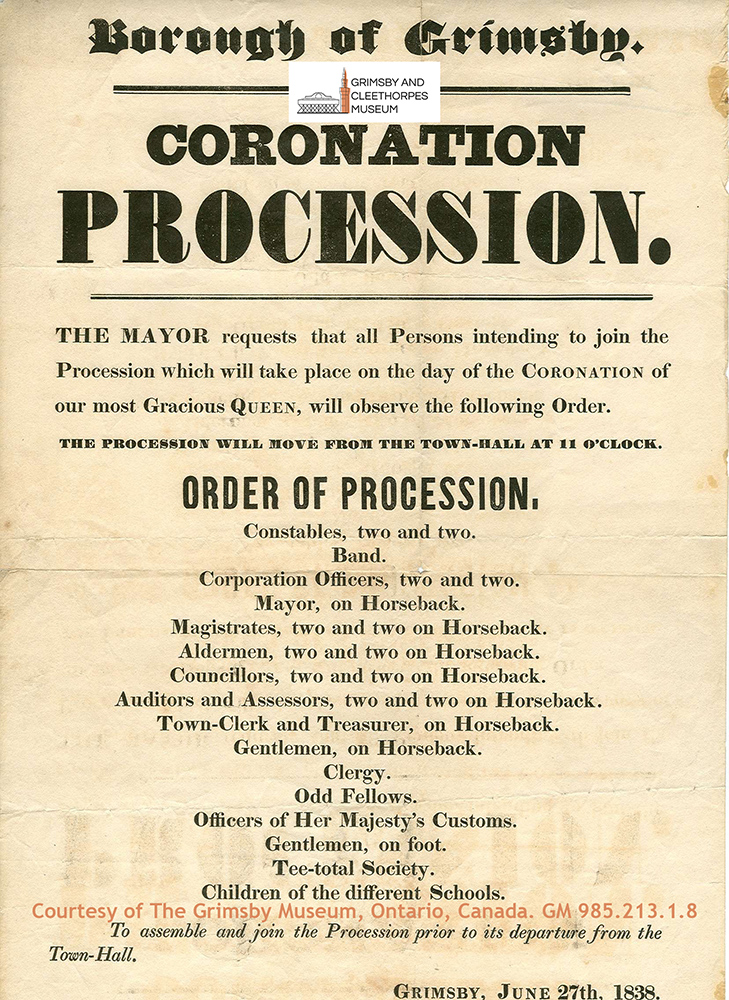 Handbill for Coronation Procession for Queen Victoria in Grimsby, England – 1838.