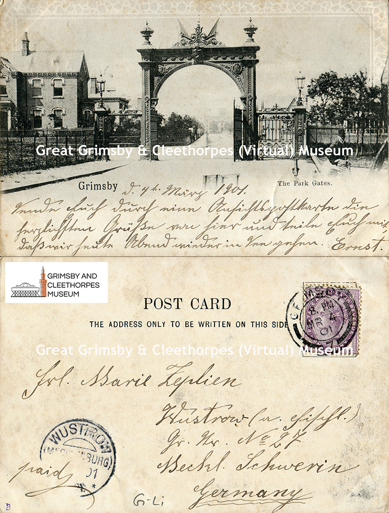 Very old, 1901 Victorian postcard; The Park gates, Grimsby.