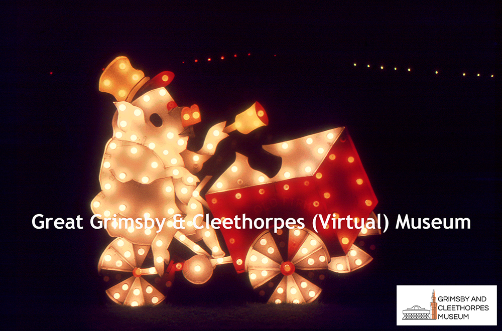 Cleethorpes illuminations; piggy ice-cream seller 1968.