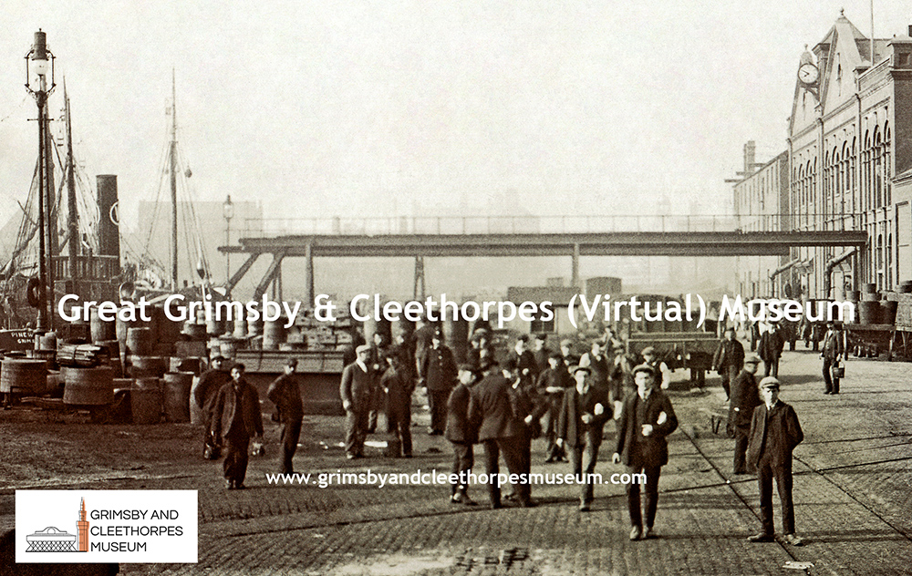 Dock workers walking past Grimsby Ice Factory on their way to work (at 7:50am) c1910.