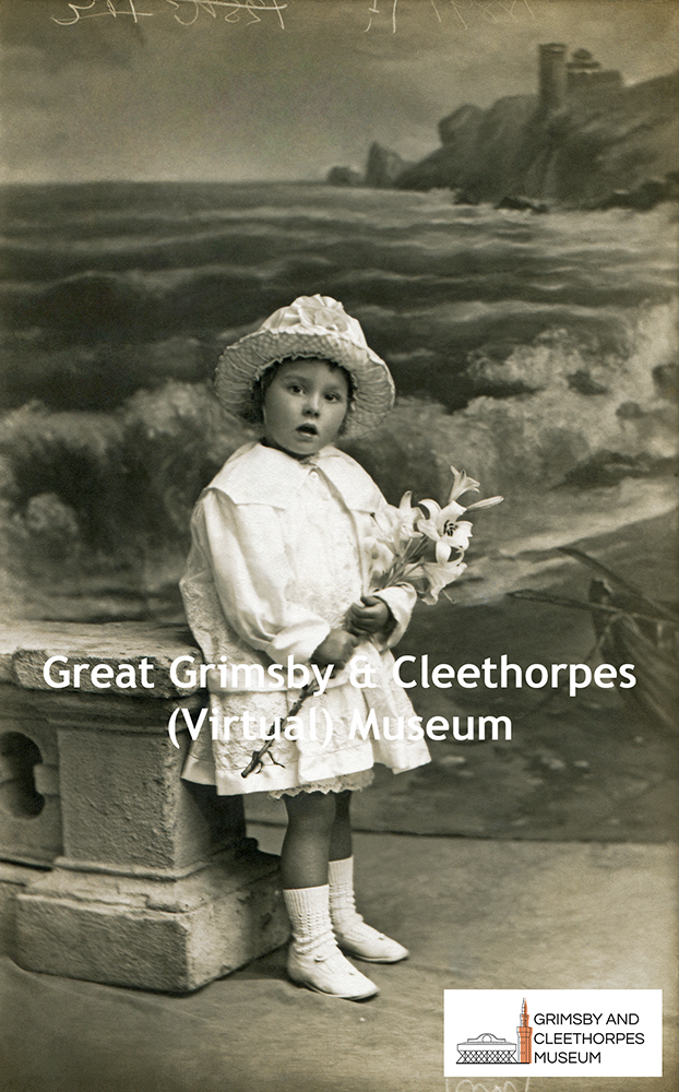 Studio portrait of a small girl and a rough sea by J. W. Hardy of Cleethorpes c1920.