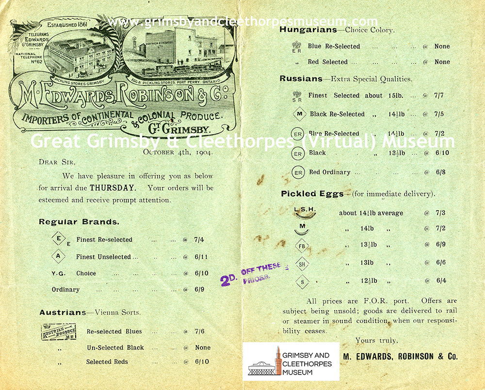M. Edwards, Robinson & Co., importers of eggs, Grimsby; a 1904 price list.
