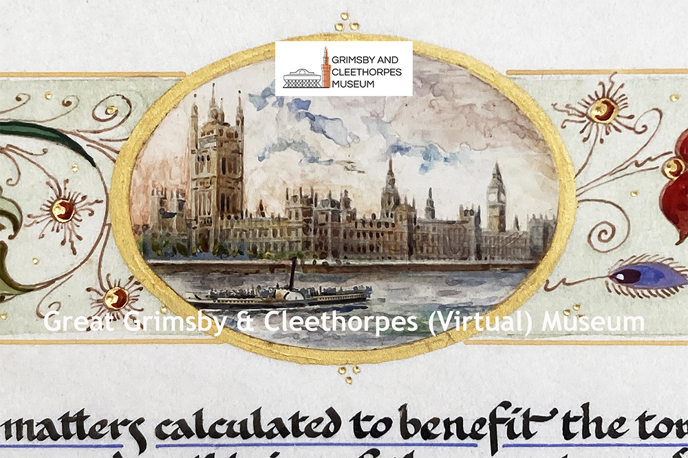 Houses of Parliament; a detail from the illuminated Councillor Franklin Thornton manuscript 1921.