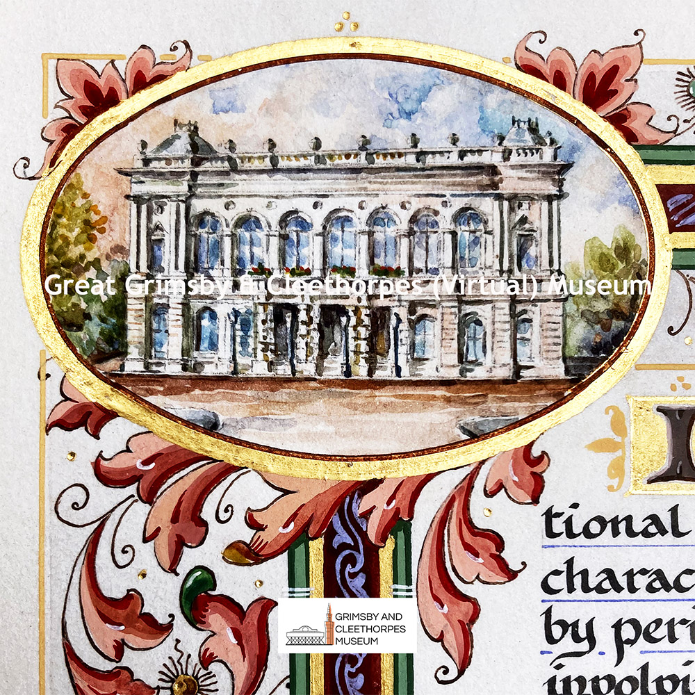 Grimsby Town Hall; a detail from the illuminated Councillor Franklin Thornton manuscript 1921.