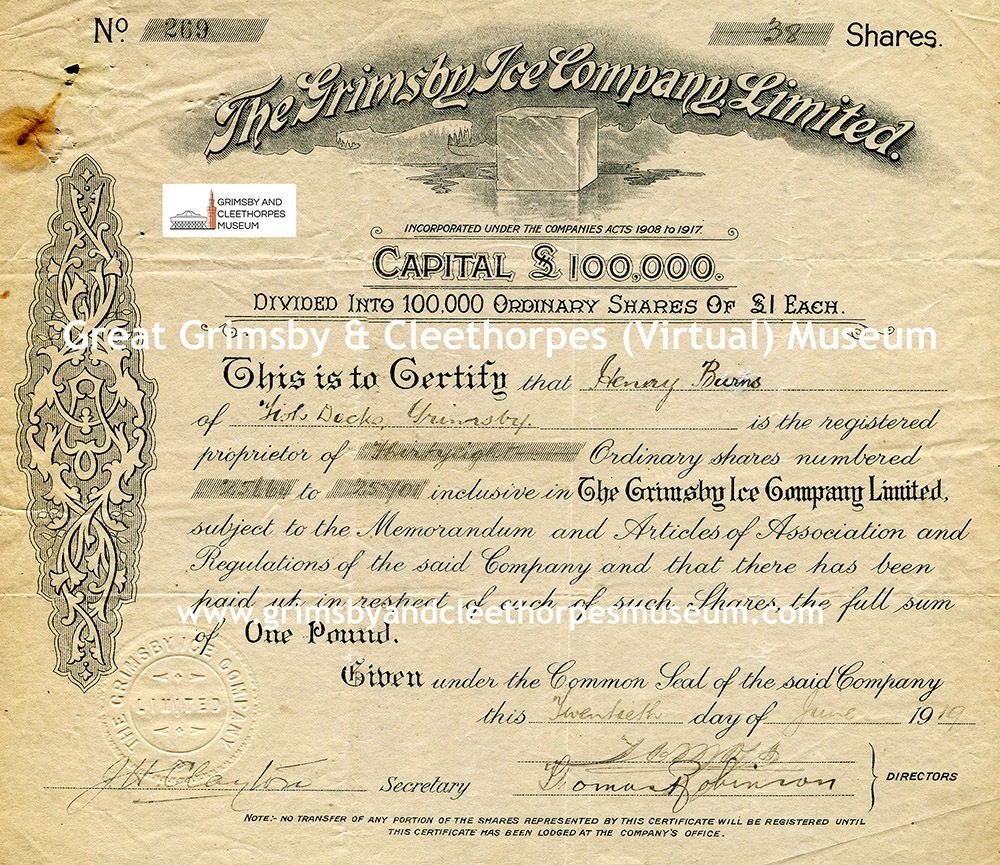The Grimsby Ice Company Ltd. shares certificate 1919.