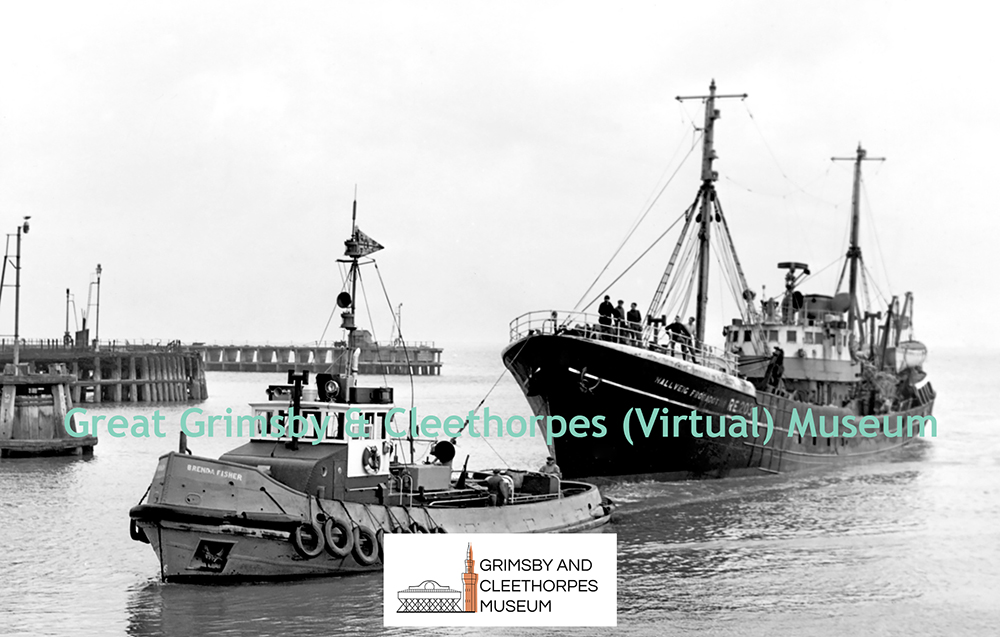 ‘Brenda Fisher’ tows ‘Hallveig Frodadottir’ RE.203 into Grimsby Docks c1960s.