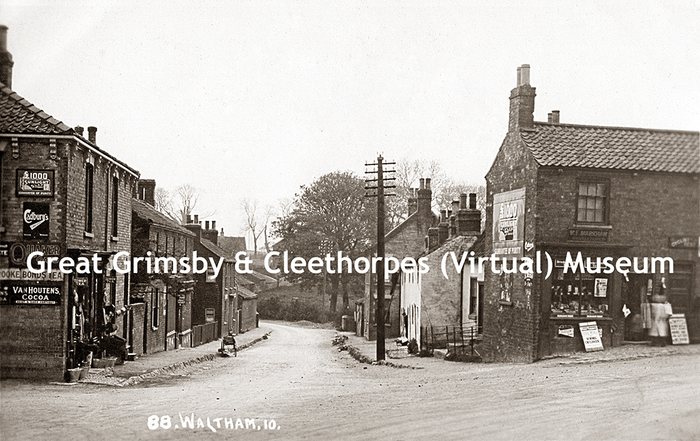 Kirkgate, Waltham; shops and enamel signs c1920.