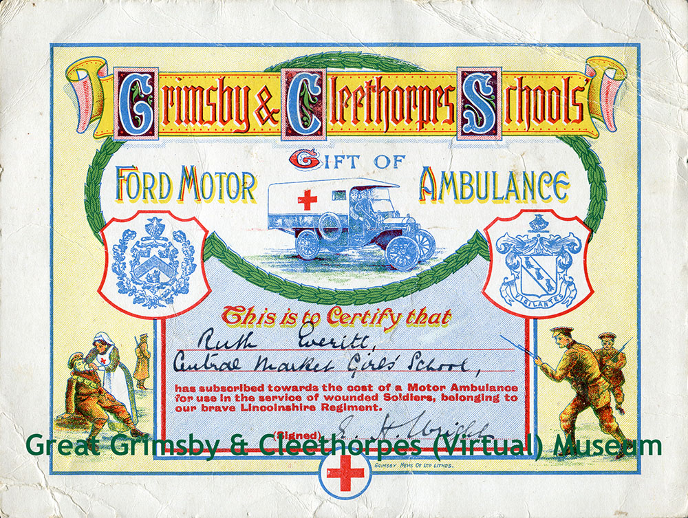 WW1 Grimsby and Cleethorpes Schools fundraising certificate.