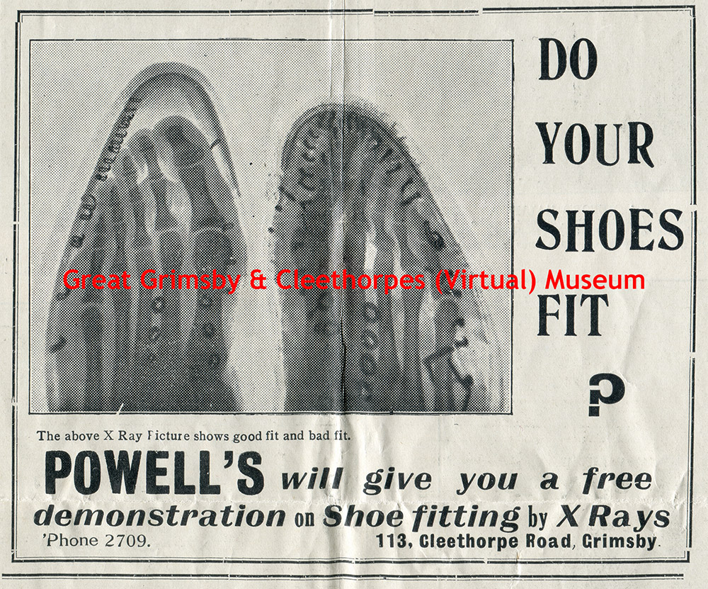 1932 Grimsby advertisement; shoe fitting by X-rays.