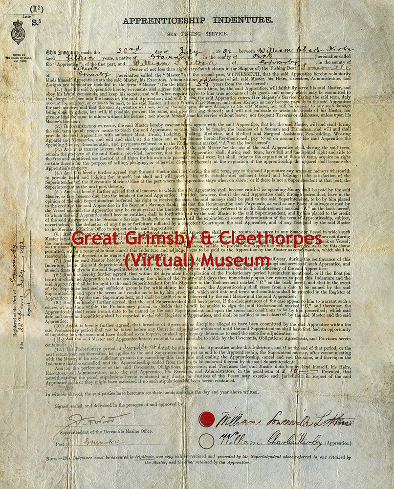 William Charles Kirby; Apprenticeship Indenture, Sea Fishing Service, Grimsby 1892.