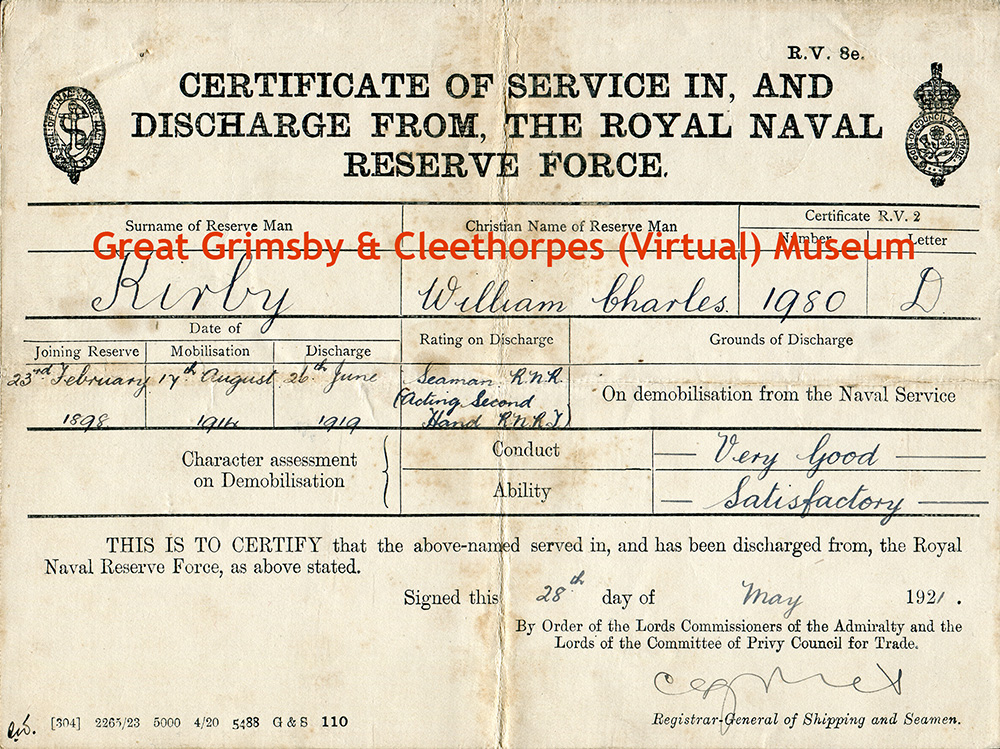 William Charles Kirby; certificate of discharge from the Royal Naval Reserve Force, 1921.