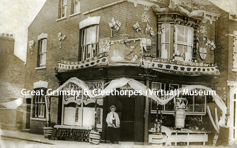 Fred Turner’s Central Fish Restaurant in Grimsby or Cleethorpes. His restaurant and ‘fresh fish stores’ is decorated for what must be the coronation of King George V in 1911. We assume that it’s Fred outside the shop holding a fish.