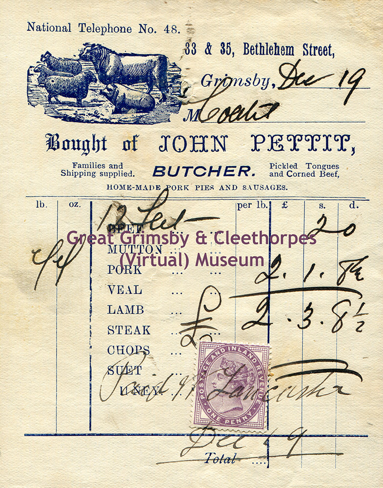 John Pettit, Grimsby Butcher Receipt.