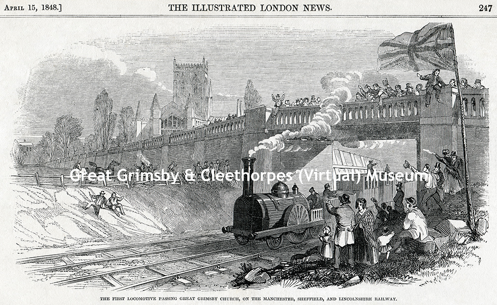 ‘The First Locomotive Passing Great Grimsby Church, on the Manchester, Sheffield and Lincolnshire Railway’ (April 1848).