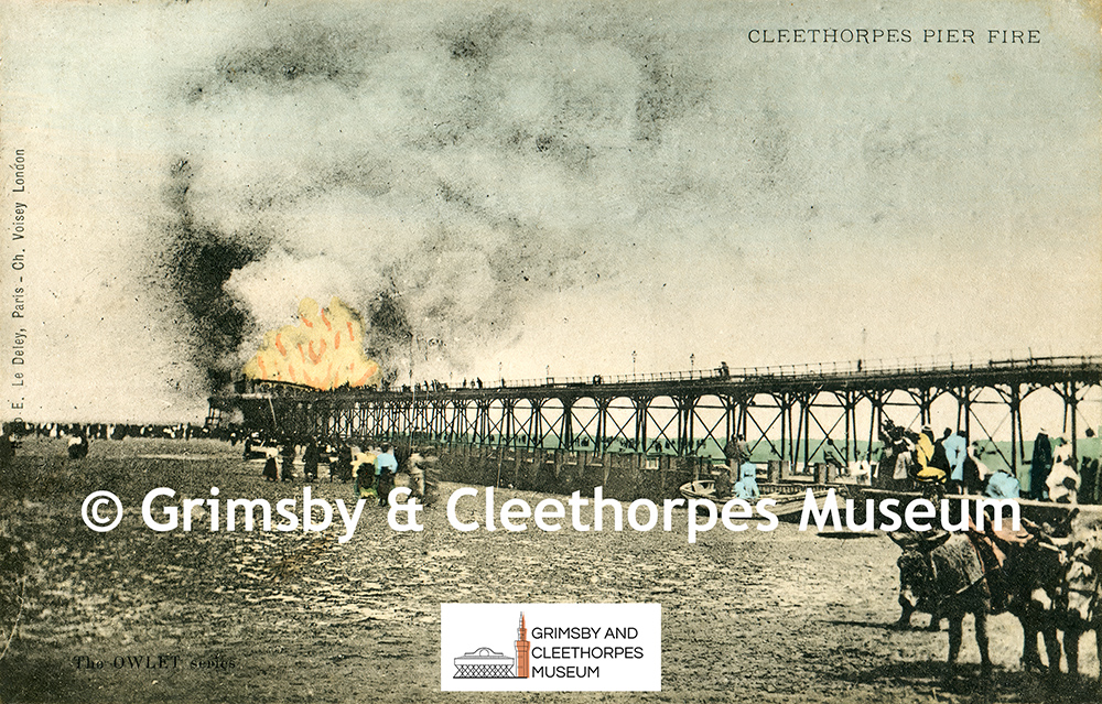 Cleethorpes Pier Fire; a Charles Voisey picture postcard 1903.