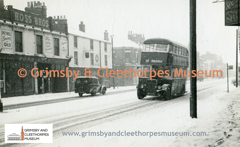 Grimsby Corporation bus JV 9900 heading along Cleethorpe Road in the direction of Park Street February 1956.