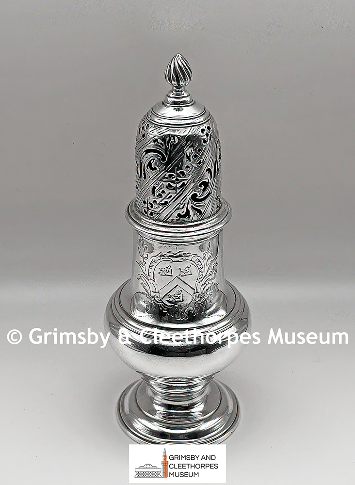 George II silver pepper or spice caster with the Grimsby Coat of Arms 1758.