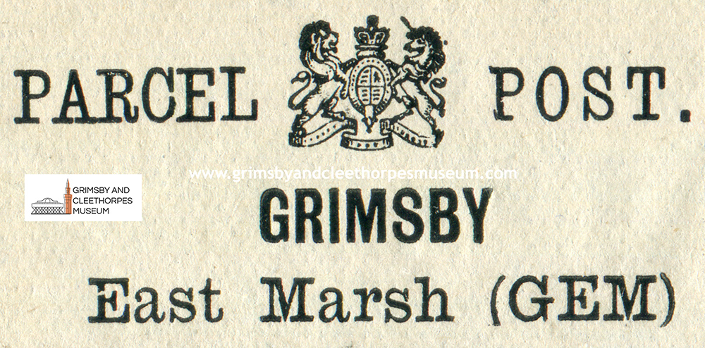 Parcel Post label; Grimsby East Marsh (GEM) 1901.
