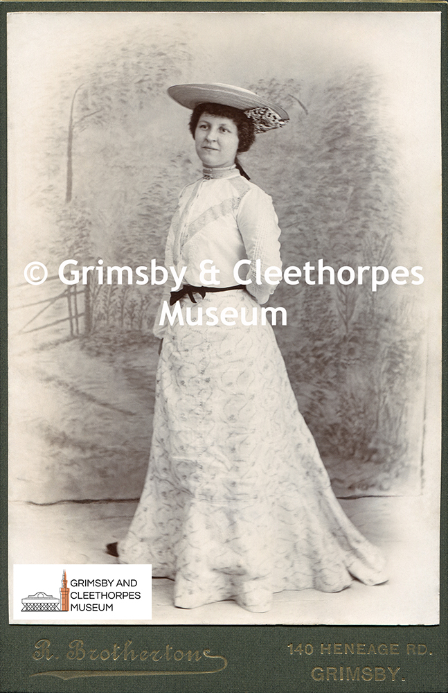 Lady with lovely dress by Brotherton, Grimsby c1890s.