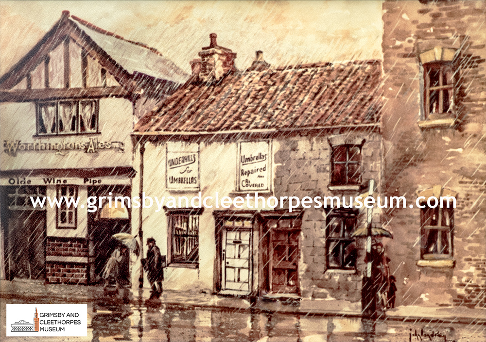 The Bull Ring, Grimsby; ‘1957 Underhills Umbrella Shop’ by John Landrey 1982.