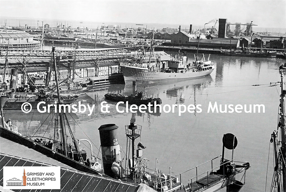 View of No. 2 Dock from an ice conveyor; ‘Churchill’ GY.585 in dock 1957.