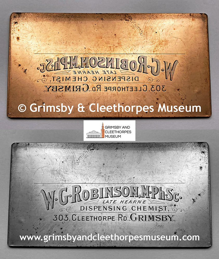 William Goulder Robinson M.Ph.Sc., pharmacist, Grimsby; engraved copper plate c1910.