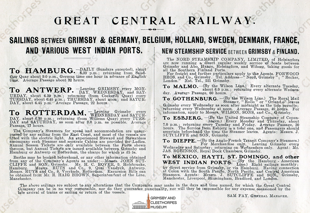 Great Central Railway; sailings between Grimsby and Germany, Belgium, Holland, Sweden, Denmark, France and various West Indian ports c1903.