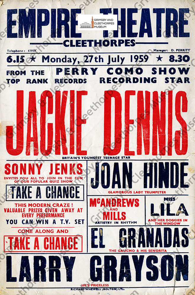 Poster advertising an evening of variety acts at the Empire Theatre, Cleethorpes; Jackie Dennis, Larry Grayson etc. 1959.