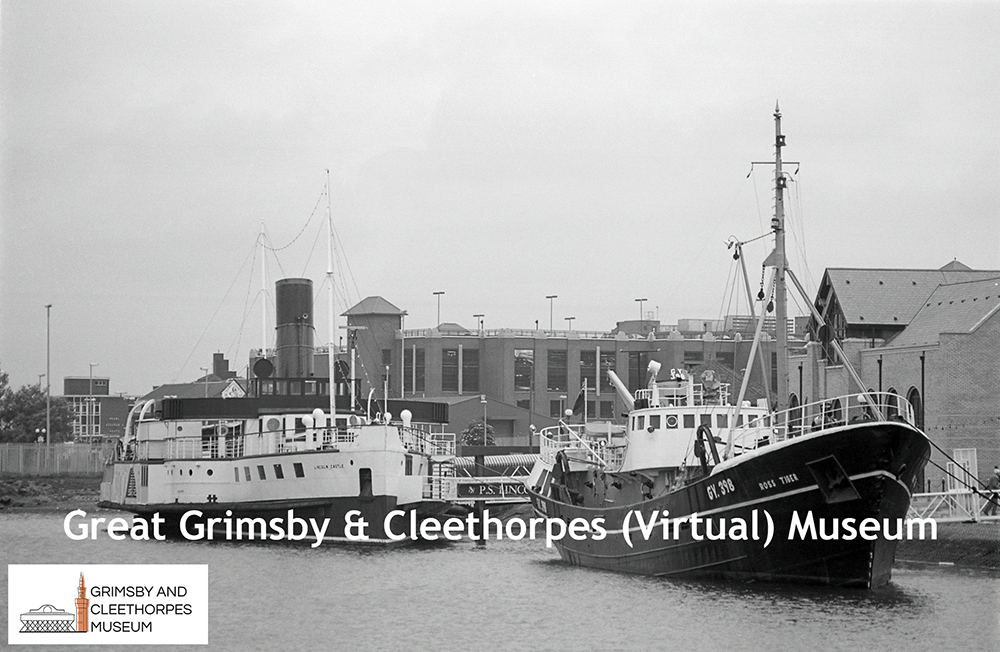 PS ‘Lincoln Castle’ and trawler ‘Ross Tiger’ GY.398 by the Fishing Heritage Centre c1992.