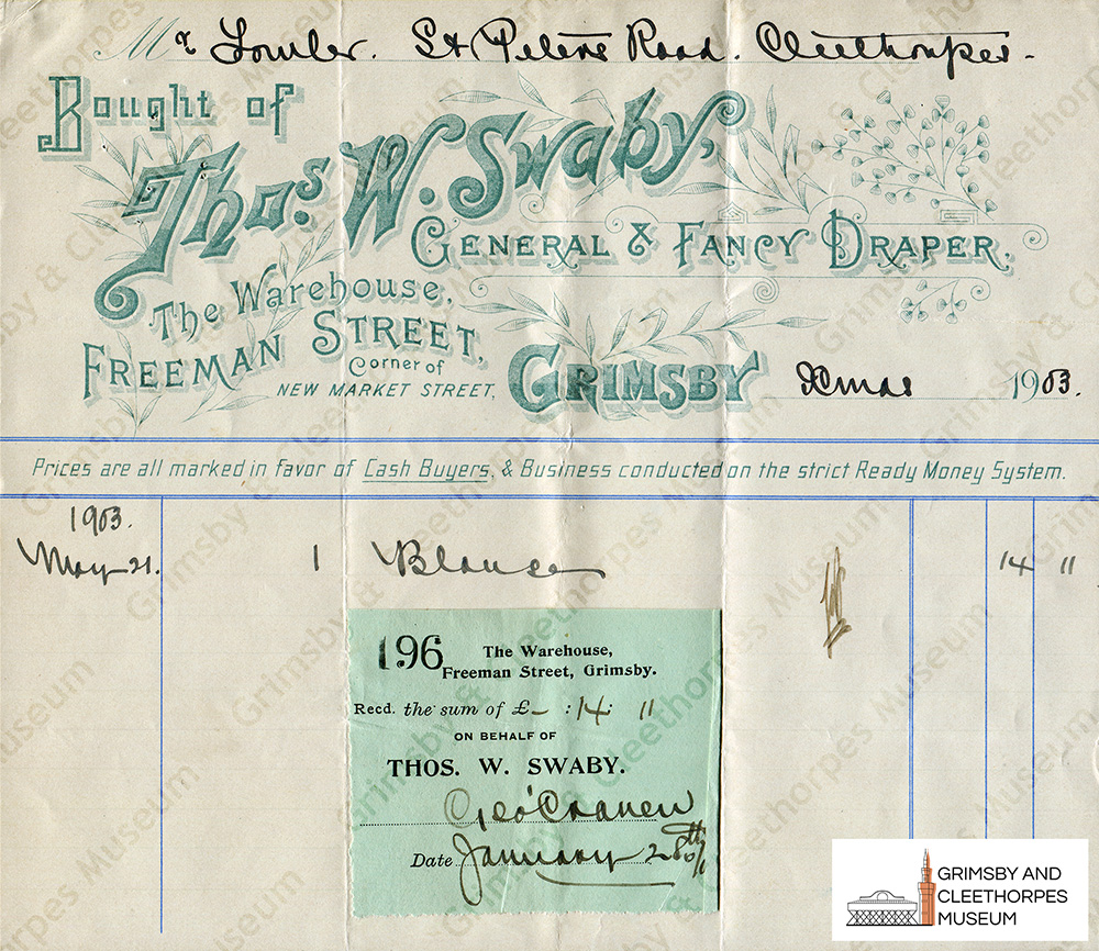 Grimsby illustrated billhead; Thomas W. Swaby, general and fancy dealer, of The Warehouse, Freeman Street Xmas 1903.
