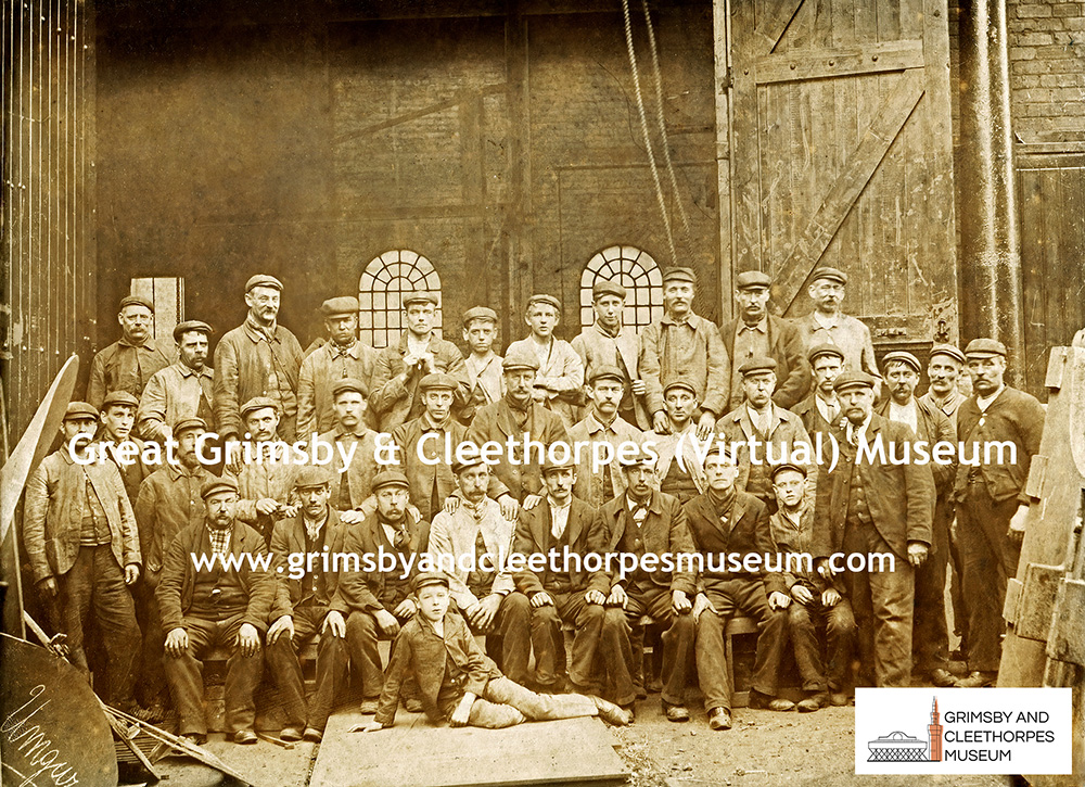 A large group of workers on Grimsby Docks with the propellor of ‘Umguza’ GY.70 c1899.