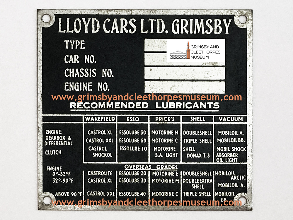 Lloyd Cars Ltd., Grimsby; Vehicle Identification Number (VIN) plate (unused) c1940s.