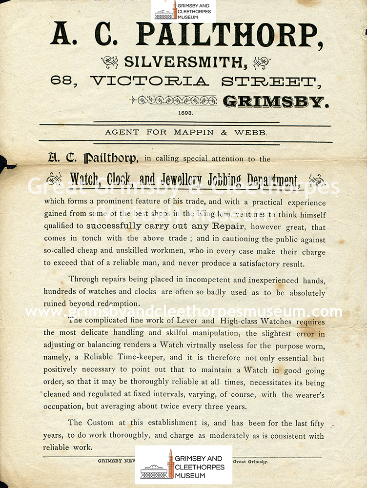 A. C. Pailthorp, silversmith, Grimsby handbill 1893.