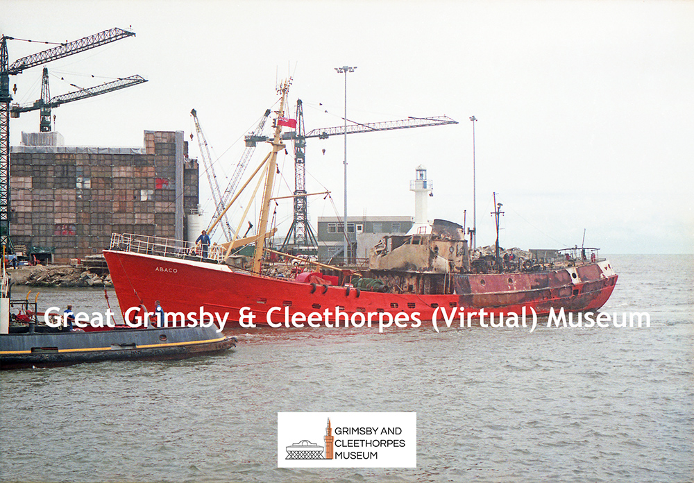 Fire damaged ‘Abaco’, ex Judaean GY.644, at Lowestoft 1984.