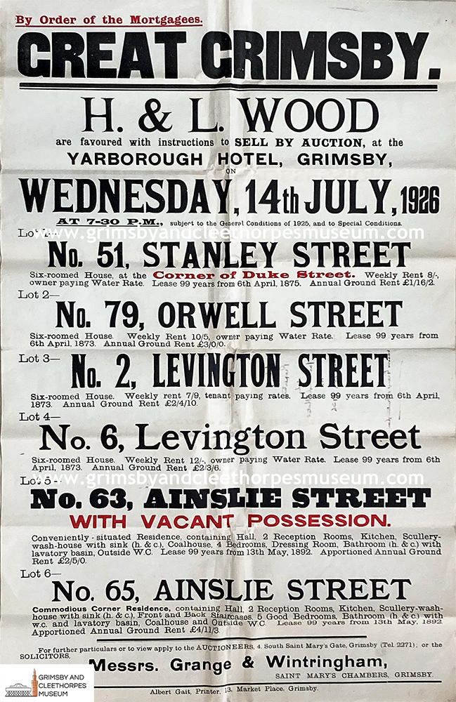 Large poster advertising the sale of 6 Grimsby houses in 1926.